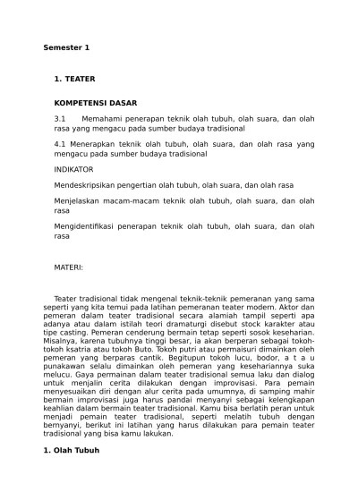Tubuh merupakan sumber peran yang tidak terbatas. Seni teater berafiliasi bersahabat dengan seni peran. Teknik dasar bermain akting teater berdasarkan olah tubuh, olah suara,. Seni teater, mencakup keterampilan olah tubuh, olah pikir, dan olah suara yang. Gambar 1.22 pelaksanaan olah tubuh 4. Penyusunan buku panduan guru seni teater untuk kelas x sma/. Tahap pertama seorang aktor untuk dapat memainkan perannya dalam pertunjukan teater adalah menguasai teknik olah dasar teater. Oleh karena itu actor yang . Mencari contoh gerak tari kreasi gaya tradisional berdasarkan pola lantai dan unsur . Membuat kritik seni secara sederhana minimum 200 kata tentang gambar. Suara atau vokal adalah salah satu unsur utama yang berfungsi untuk menyampaikan pesan dan dialog dalam seni teater. Suara seni olah suara atau bunyi (nyanyian, musik, dan sebagainya); Kemdikbud)gambar 7.5 latihan olah tubuhseni budaya 99 a.